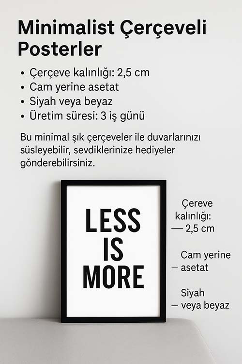 İnce siyah veya beyaz çerçeveli posterlerle yaşam alanlarınıza minimalist bir dokunuş katmak artık çok kolay. Hem sade hem şık bir dekorasyon elde etmek istiyorsanız, asetatlı çerçevelerin farkını mutlaka deneyin. Dilerseniz farklı renk ve model alternatifleri için bizimle iletişime geçebilir, mekânınıza özel tasarımlar oluşturabilirsiniz.