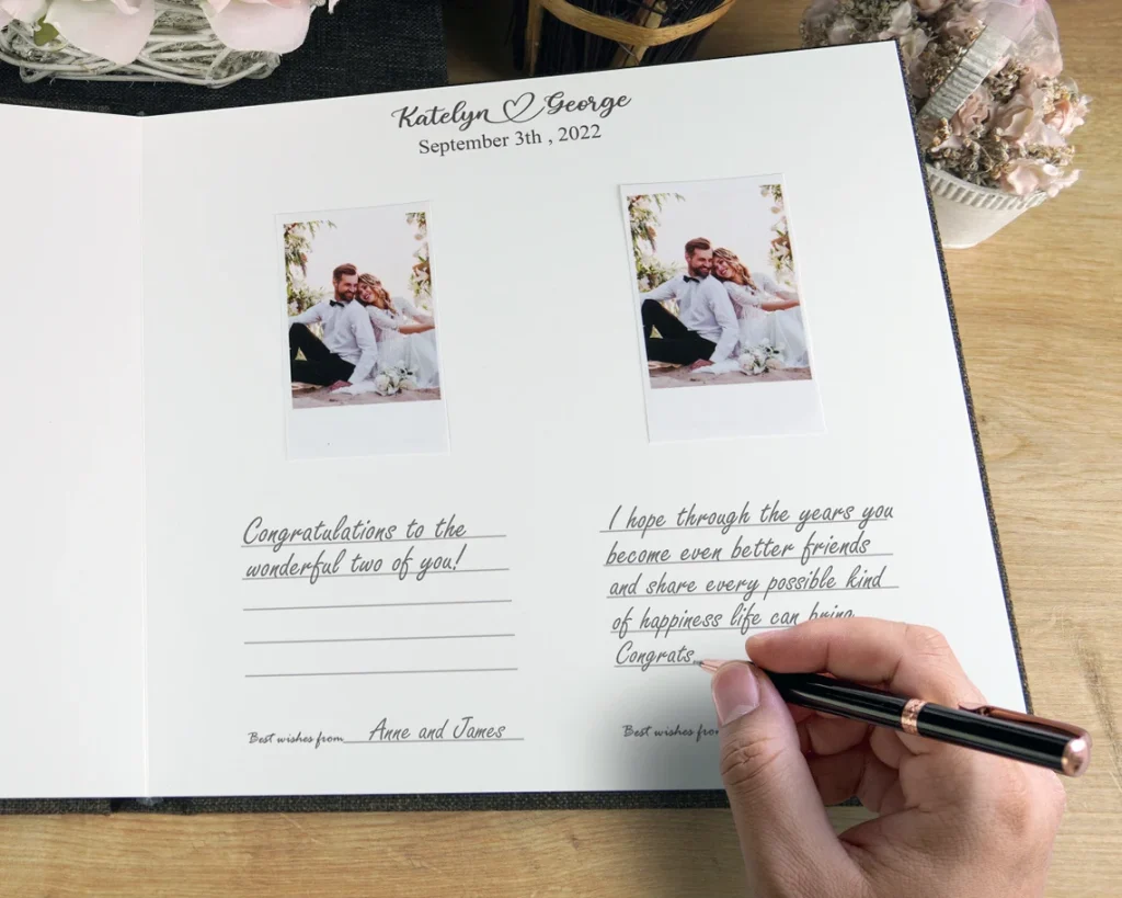 Defterin iç sayfaları, konukların dileklerini, duygularını ve anılarını yazabilecekleri şekilde tasarlanıyor. Ayrıca fotoğraf alanları sayesinde konuklarınız anlık Instax veya Polaroid karelerini sayfalara yapıştırarak defteri bir nevi “canlı anı kitabına” dönüştürebiliyor.